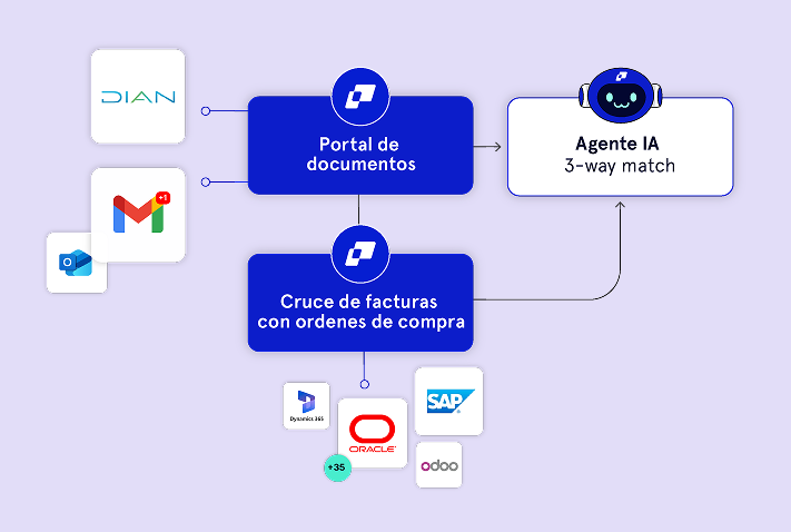 - Flujo de recepción de documentos: Conecta con la DIAN para automatizar la recepción de facturas electrónicas y también gestiona cuentas de cobro y facturas internacionales en la nube.