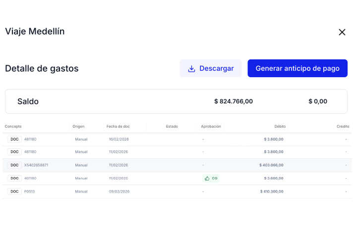 - Flujo de pago a empleados: Administra pagos de reembolsos, salarios y viáticos integrando bancos y canales de comunicación, todo desde un solo lugar.