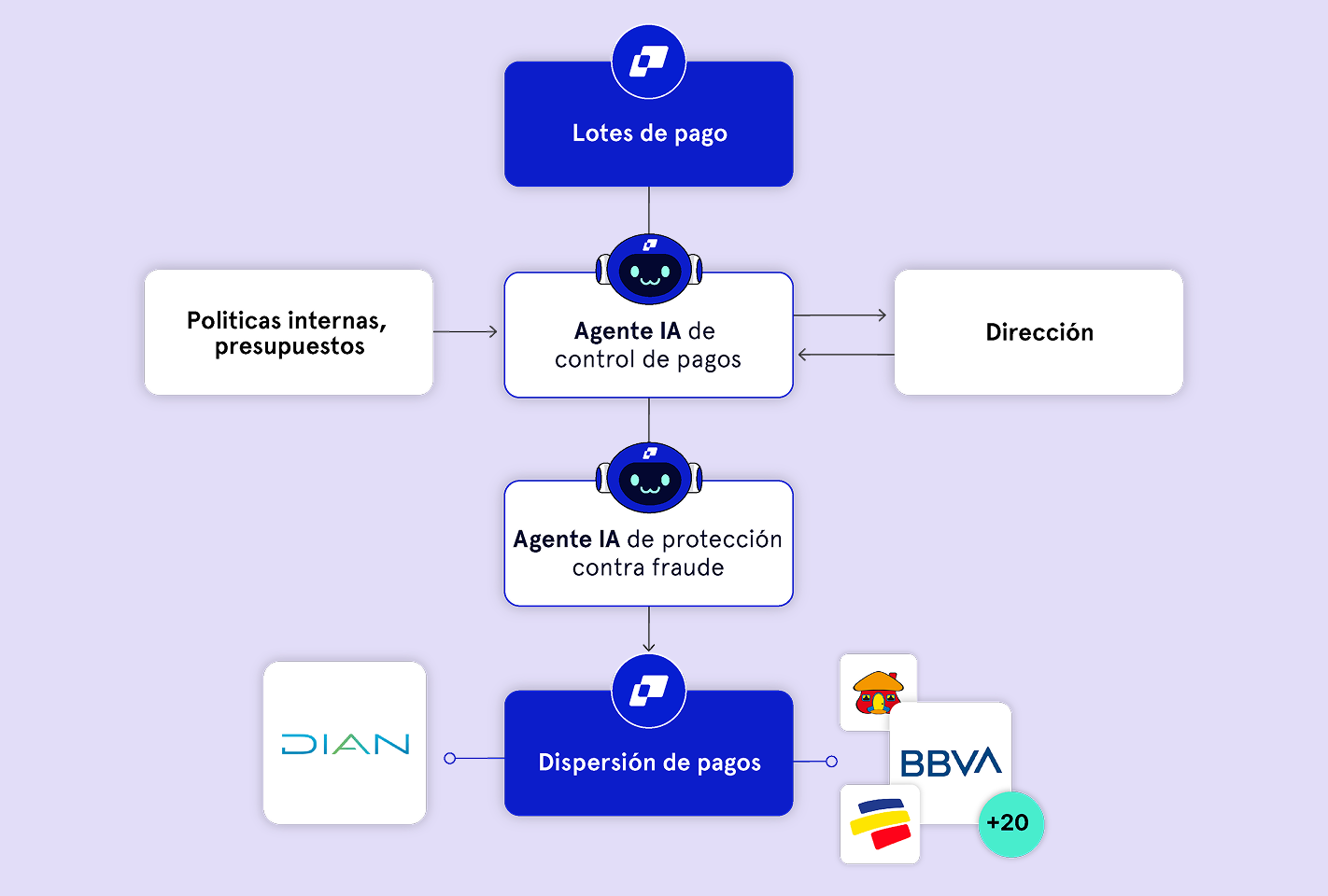- Flujos de control y aprobaciones: Supervisa todo el ciclo financiero y contable con distintos niveles de aprobación y validaciones automáticas de agentes de IA.
